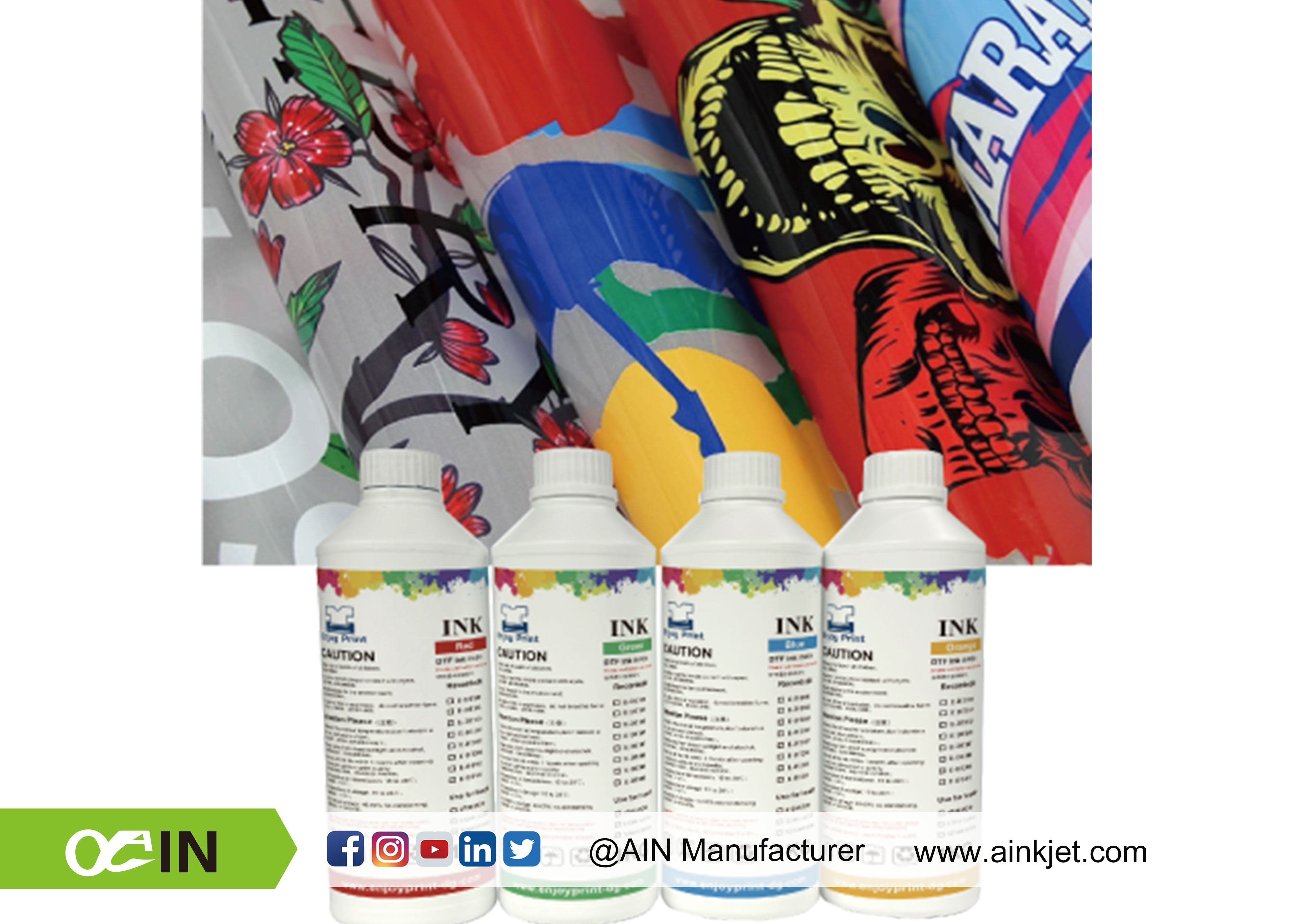 A AIN oferece diferentes cores de tintas DTF, como W, Y, K, M, C, Or, Gr, e também rosa fluorescente e amarelo fluorescente.